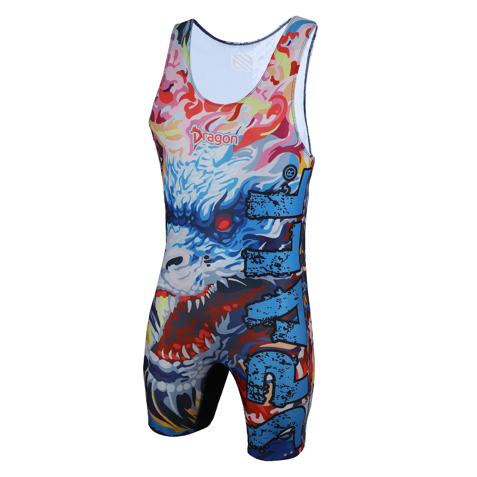 Made of stretchable material high performance one piece athletic uniform designed for wrestling, powerlifting, and intense gym training.